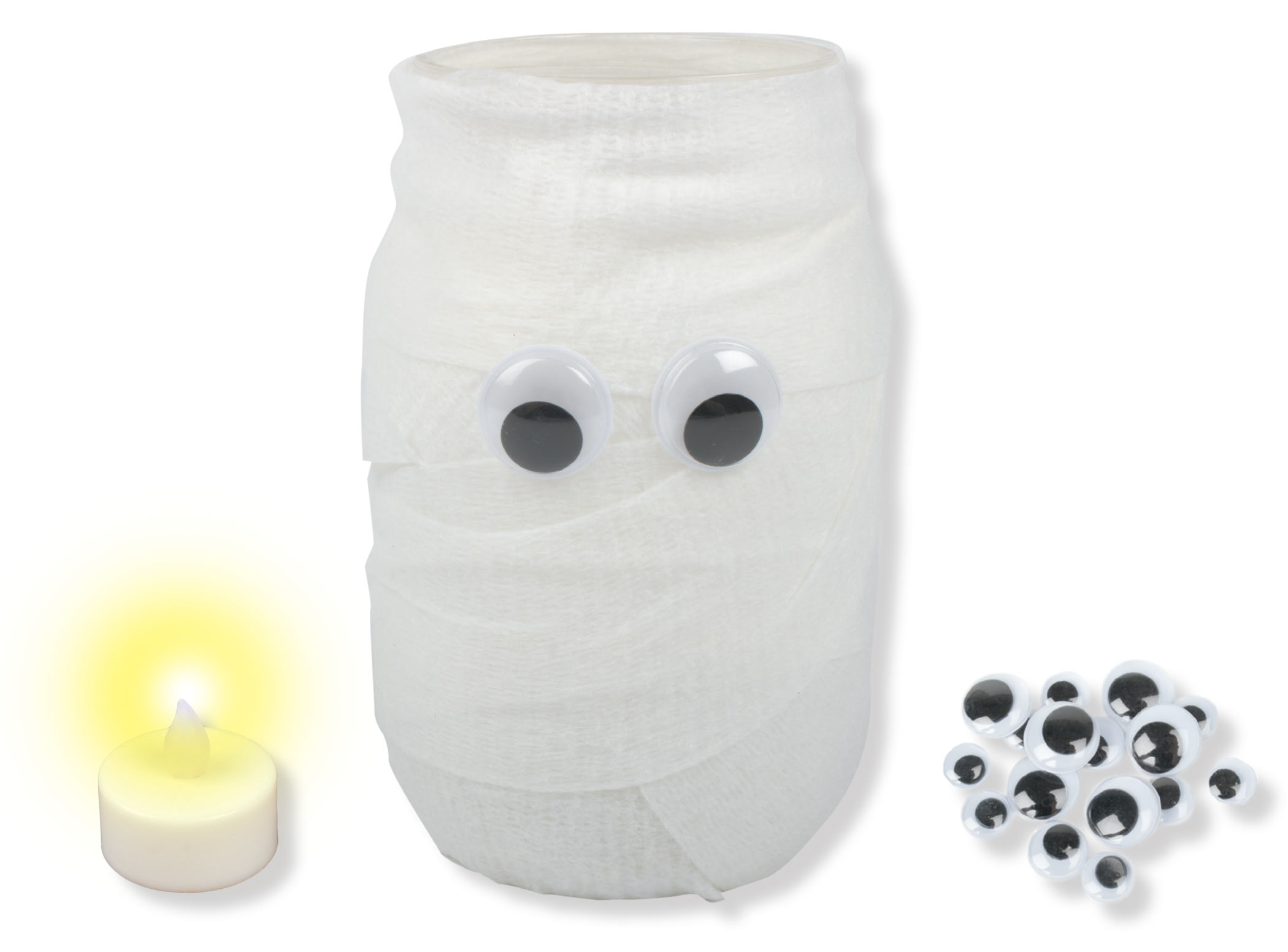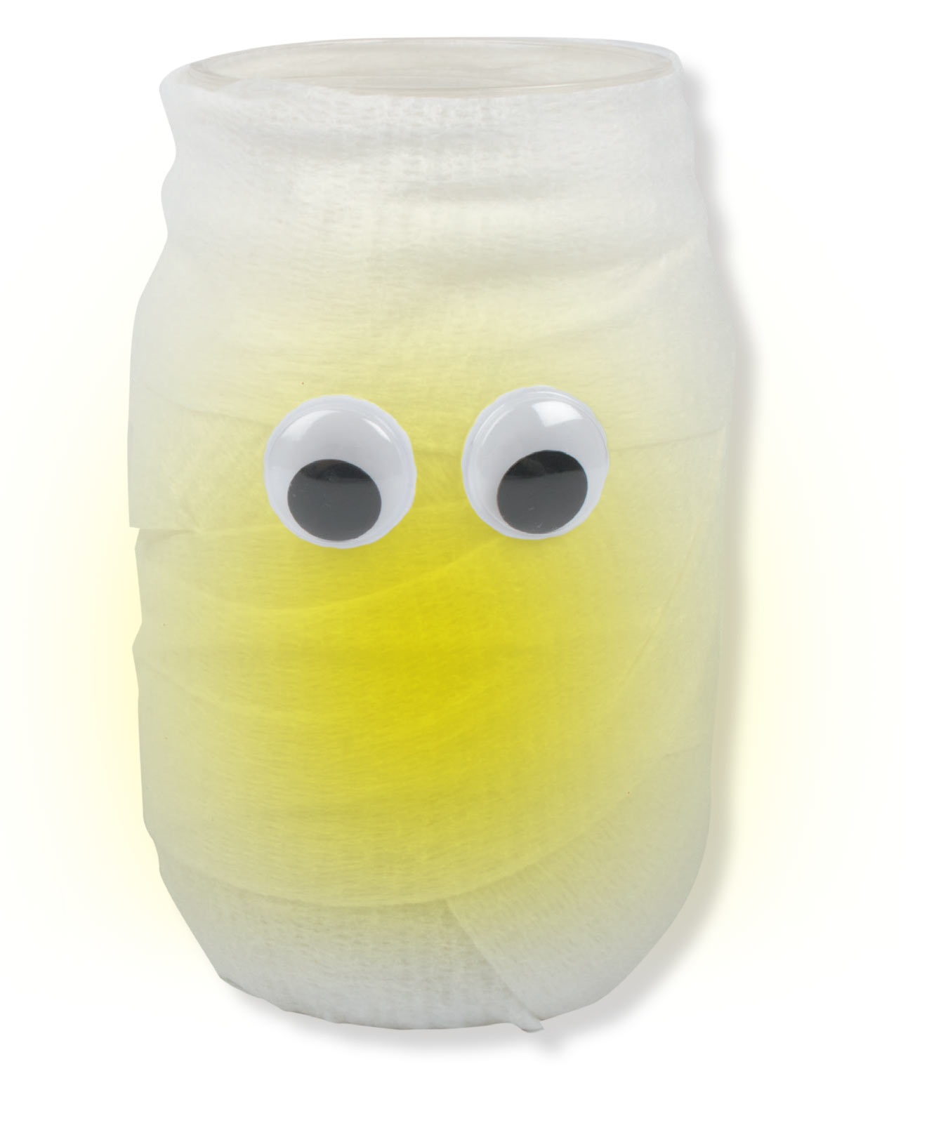 4. Turn on the small battery-operated candle. Place it in the jar. Watch your mummy come to life with a soft glow!