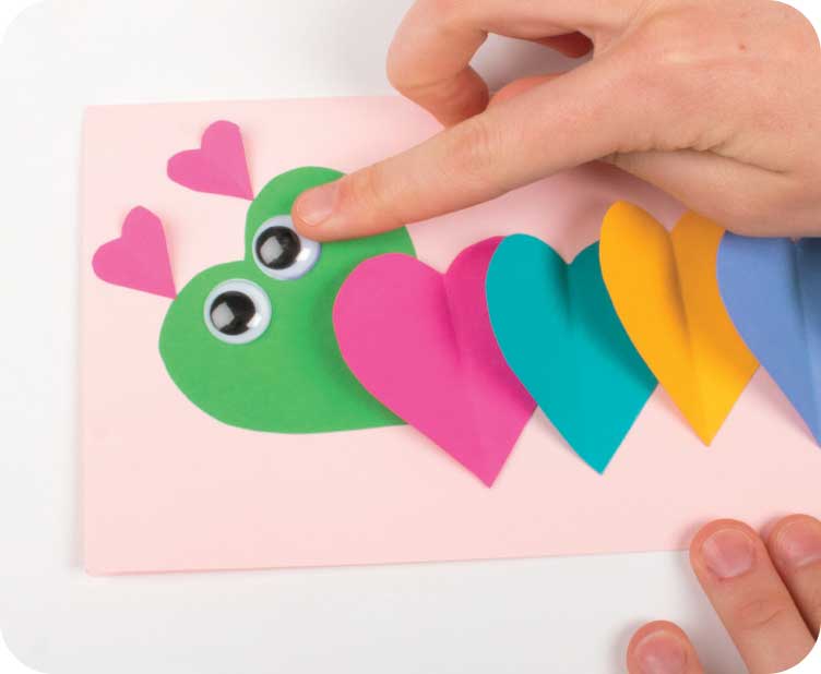 11. Glue down one half of each antennae heart above the head. Glue googly eyes onto the head.